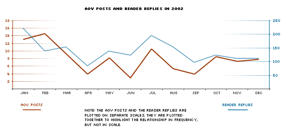 This chart shows the relationship between aov posts and readers replies over 2002 (note – the chart is a little misleading – the two lines are charted on separate scales).