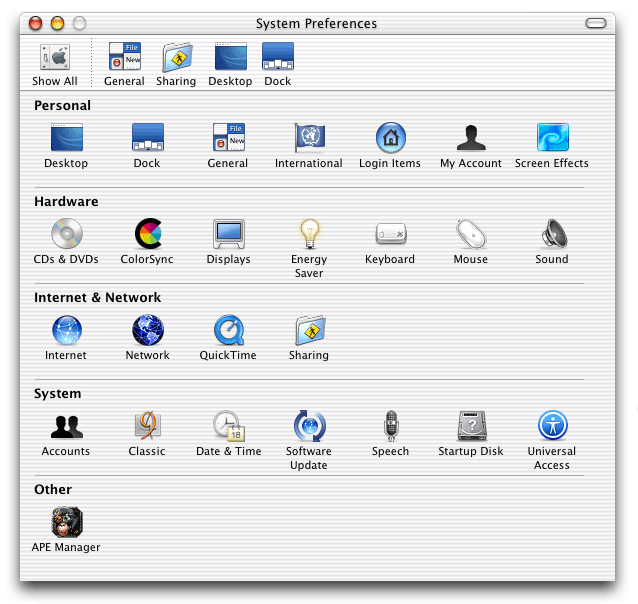 The System Preferences was generally well organized, though I was completely confounded by the bar along the top of the System Preferences window. It contains duplicates of icons in the System preferences window. It is customizable, and I suppose it is intended as a place to put frequently-used items. Duplicating icons in this already crowded window seems to be an odd choice. This is particularly puzzling since other applications use a similar-looking icon row at the top of a preference window in the same way tabs are traditionally used. I welcome any insight into this design decision.